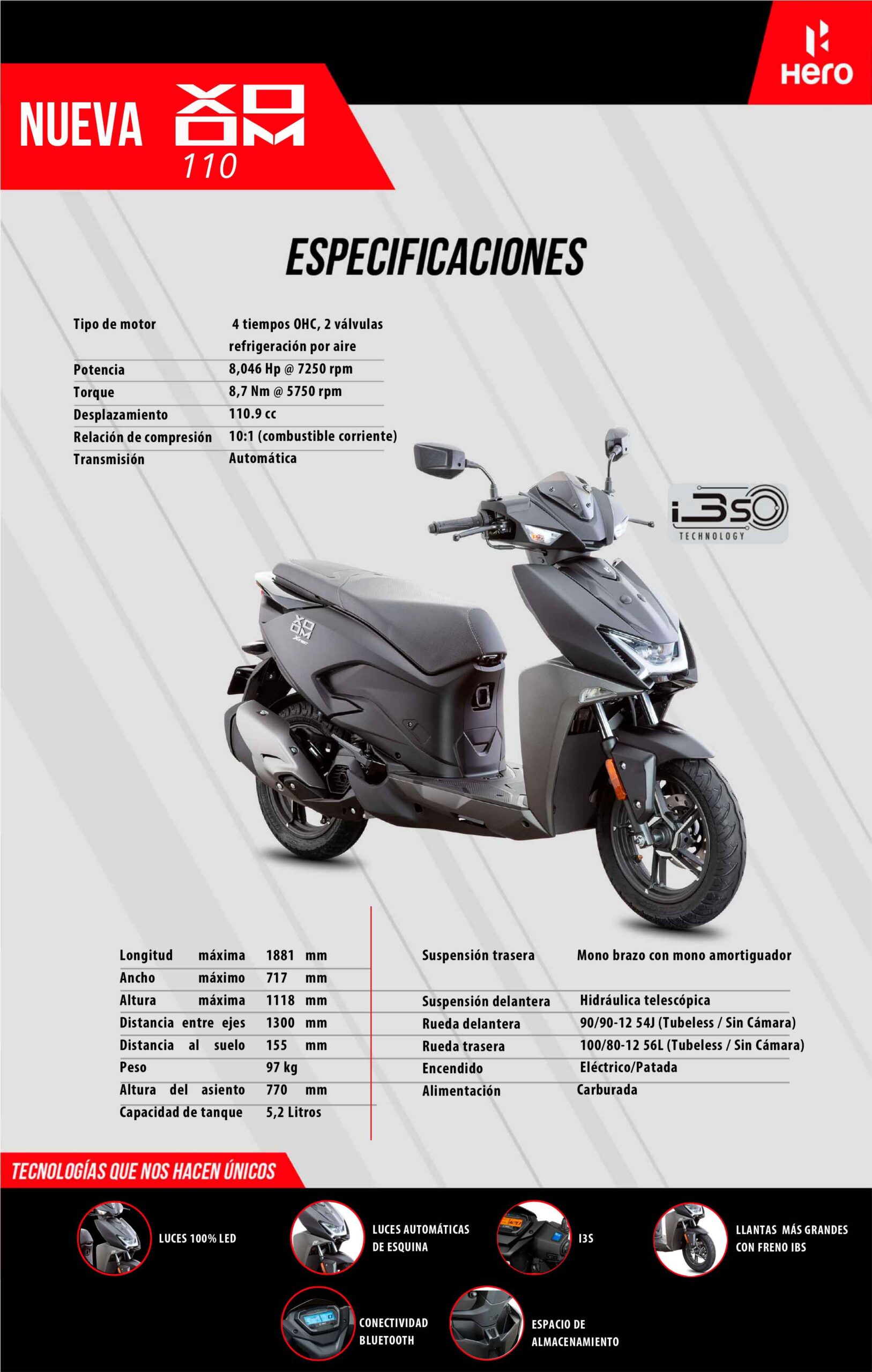 Muévete al ritmo de la nueva generación con la Hero Xoom 110, la scooter automática que transforma tu manera de desplazarte. Su diseño compacto y dinámico está pensado para fluir contigo en la ciudad, mientras que sus luces LED frontales y traseras, las luces de giro automáticas y el tablero digital con conectividad Bluetooth garantizan seguridad y estilo en cada recorrido.