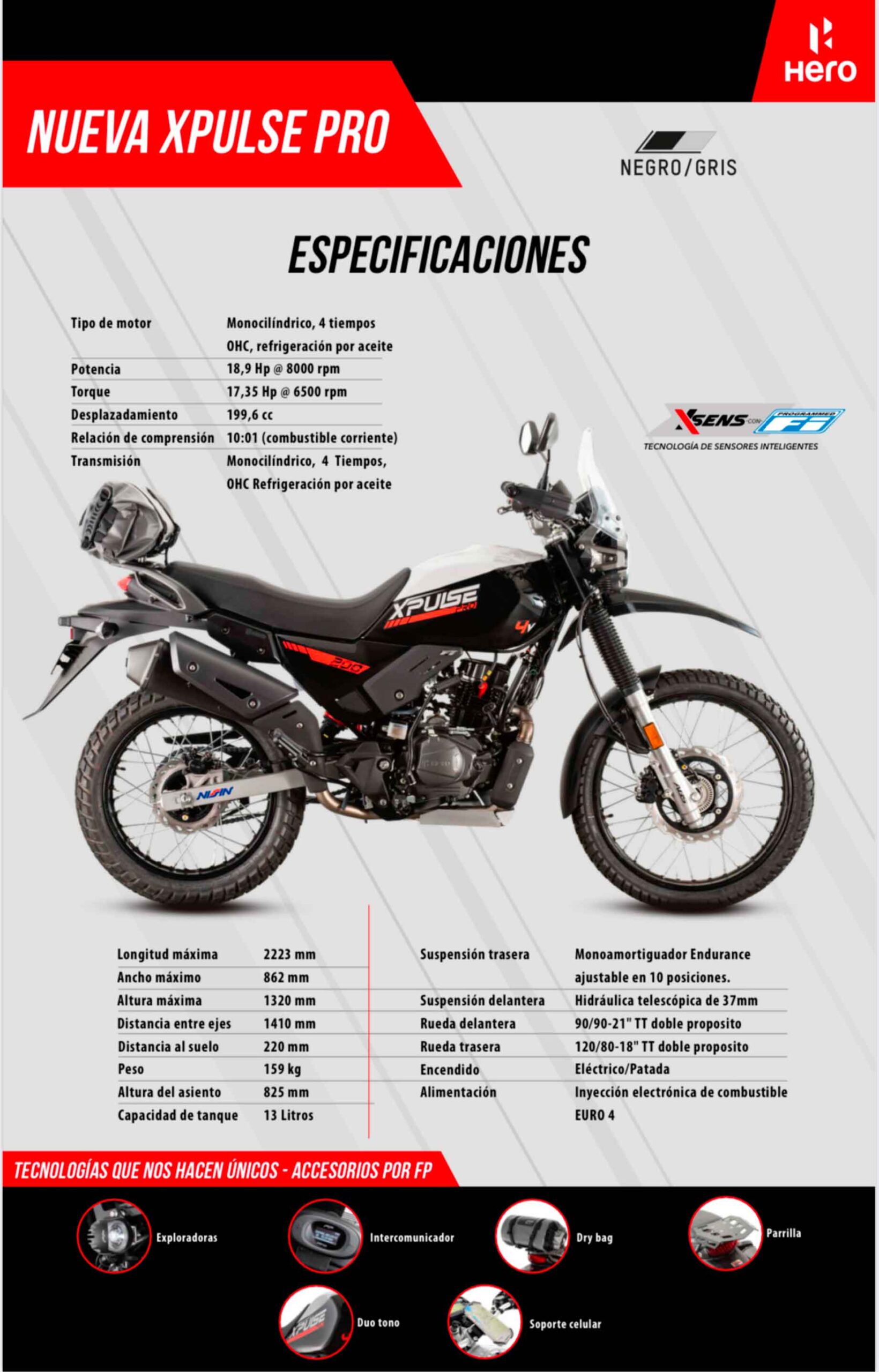La Xpulse Pro 4V redefine el concepto de aventura en Colombia, posicionándose como la motocicleta doble propósito más potente de su segmento. Su motor de 200 cc con tecnología de 4 válvulas entrega 19 HP, asegurando un rendimiento superior para enfrentar cualquier terreno. Diseñada para los amantes de la aventura, esta moto cuenta con accesorios FP y un diseño renovado que combina funcionalidad y estilo. Además, está equipada con la última tecnología que permite disfrutar de los paisajes más desafiantes y hermosos del país. La Xpulse Pro 4V no solo es sinónimo de potencia, sino también de versatilidad, siendo la compañera ideal para quienes buscan explorar sin límites.